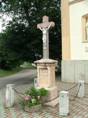 A kápolna közelében levő kör alakú építmény közepén álló hatalmas, dinamikus kálváriacsoport (Golgota), Schweiger Antal 1770 körüli alkotása. Jézus Krisztus keresztje tövében Mária Magdolnát, a két oldalán Szűz Mária és Szent János apostol alakját látjuk. A fatörzs jellegű keresztre feszítve a latrok alakja torzított testtartásban jelenik meg.
