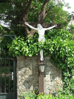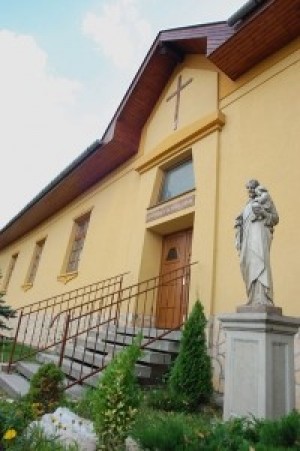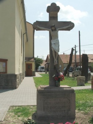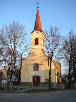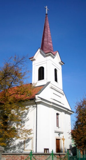 A község főutcáján álló egyhajós templom, amely 1822-ben épült, előtte 19. századi kőkereszt.