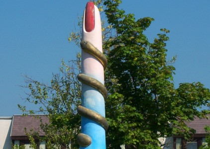 A szobor alkotója a Salgótarjánban született (1950–) efZámbó István 1958 óta él Szentendrén, aki a képzőművészet mellett zenével is foglalkozik: a Bizottság Együttes és a Happy Dead Band alapító tagja. Az általa készített átalakított műgyanta, az égre nyúló új pozitív jel, mely a felső és a lenti lét összekötésére utal. A rajta lévő kígyó, a bibliai Éva csábítója, itt most nem a rosszra csábít, inkább figyelmeztet, a dekorativitást segíti.